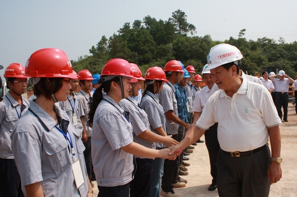 自治區(qū)黨委常委、南寧市市委書記車榮福與六欽1標廣西路橋建設(shè)者親切握手