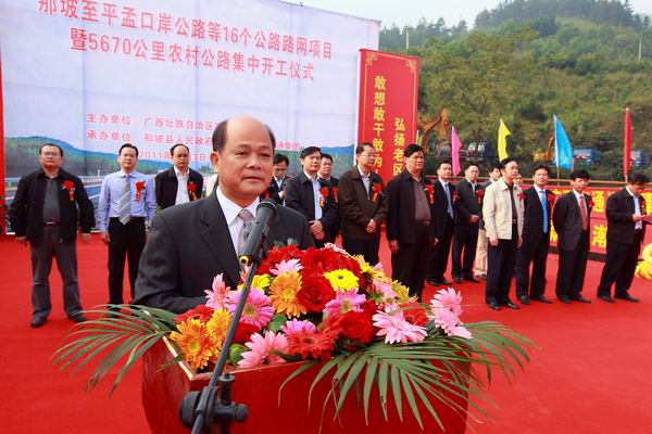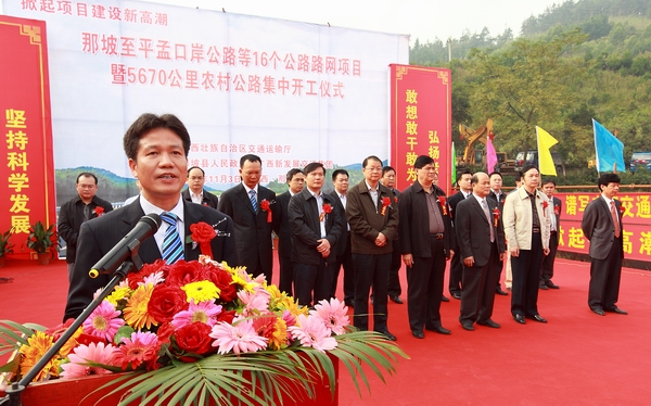 為貫徹落實(shí)自治區(qū)黨委、政府在全區(qū)掀起項(xiàng)目建設(shè)新高潮的決策部署,沖刺第四季度,完成全年公路建設(shè)目標(biāo)任務(wù),自治區(qū)交通運(yùn)輸廳于11月3日舉行全區(qū)公路路網(wǎng)改造項(xiàng)目集中開(kāi)工儀式。由集團(tuán)公司承辦的分會(huì)場(chǎng)——那坡至平孟口岸公路等16個(gè)公路路網(wǎng)項(xiàng)目暨5670公里農(nóng)村公路集中開(kāi)工儀式在百色市那坡縣德隆鄉(xiāng)隆重舉行。自治區(qū)交通運(yùn)輸廳紀(jì)檢組長(zhǎng)、廳黨組成員朱名勝,百色市市委常委、政法委書(shū)記周武紅,市人大常委會(huì)黨組成員黃五同,集團(tuán)公司黨委書(shū)記、董事長(zhǎng)朱堅(jiān)和、總經(jīng)理李定倫、黨委副書(shū)記張友坐、副總經(jīng)理劉明洪、總工程師覃炳賢,自治區(qū)公路管理局、百色市公路管理局、交通運(yùn)輸局、那坡縣四家班子、集團(tuán)公司直屬各單位領(lǐng)導(dǎo)及有關(guān)部門(mén)負(fù)責(zé)人等出席開(kāi)工儀式。