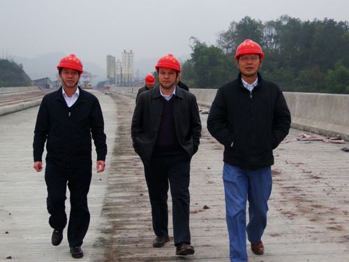 集團(tuán)公司朱堅(jiān)和董事長(左一)、李定倫總經(jīng)理(右一)視察永寧河大橋施工現(xiàn)場