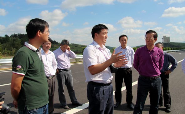 圖3:自治區(qū)交通運(yùn)輸廳副廳長梁毅(前右一)在欽崇高速公路項(xiàng)目檢查調(diào)研