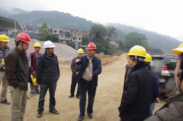 圖為集團公司總經理李定倫(圖中)、總工程師覃炳賢(右二)在那平路項目施工現場指導工作