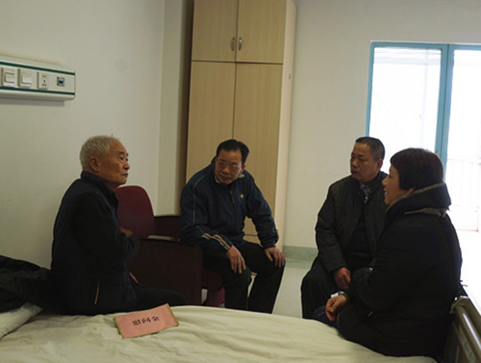 集團(tuán)公司黨委副書(shū)記、工會(huì)主席張友坐(右二),總工程師覃炳賢(左二)到醫(yī)院看望慰問(wèn)患病住院的老同志。