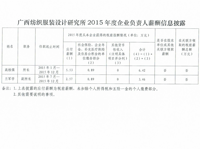 廣西紡織服裝設(shè)計(jì)研究所2015年度企業(yè)負(fù)責(zé)人薪酬信息披露