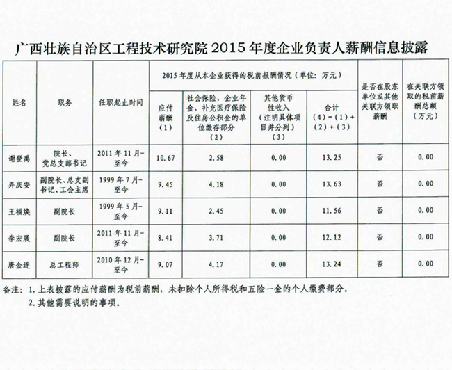 廣西壯族自治區(qū)工程技術研究院2015年度企業(yè)負責人薪酬信息披露