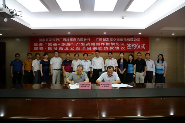 6月9日,集團(tuán)公司與國(guó)家開(kāi)發(fā)銀行廣西分行在南寧簽訂戰(zhàn)略合作框架協(xié)議。集團(tuán)公司黨委書(shū)記、董事長(zhǎng)朱堅(jiān)和,黨委副書(shū)記、副董事長(zhǎng)、總經(jīng)理唐咸秋,黨委委員、總會(huì)計(jì)師鄧遠(yuǎn)志,國(guó)家開(kāi)發(fā)銀行廣西分行黨委書(shū)記、行長(zhǎng)謝志軍,副行長(zhǎng)呂軍等領(lǐng)導(dǎo)出席簽約儀式。簽約前,雙方進(jìn)行了友好會(huì)談,雙方重點(diǎn)圍繞賀州至巴馬高速公路、融水至河池高速公路、國(guó)省干線公路及沿線地區(qū)的“交通+旅游”項(xiàng)目開(kāi)展深度戰(zhàn)略合作等方面進(jìn)行了深入的交流與探討,并達(dá)成了一致共識(shí)。座談會(huì)后,唐咸秋與呂軍分別代表雙方簽訂戰(zhàn)略合作框架協(xié)議。雙方有關(guān)部門負(fù)責(zé)人參加簽約儀式。(集團(tuán)公司 投資改革發(fā)展部)