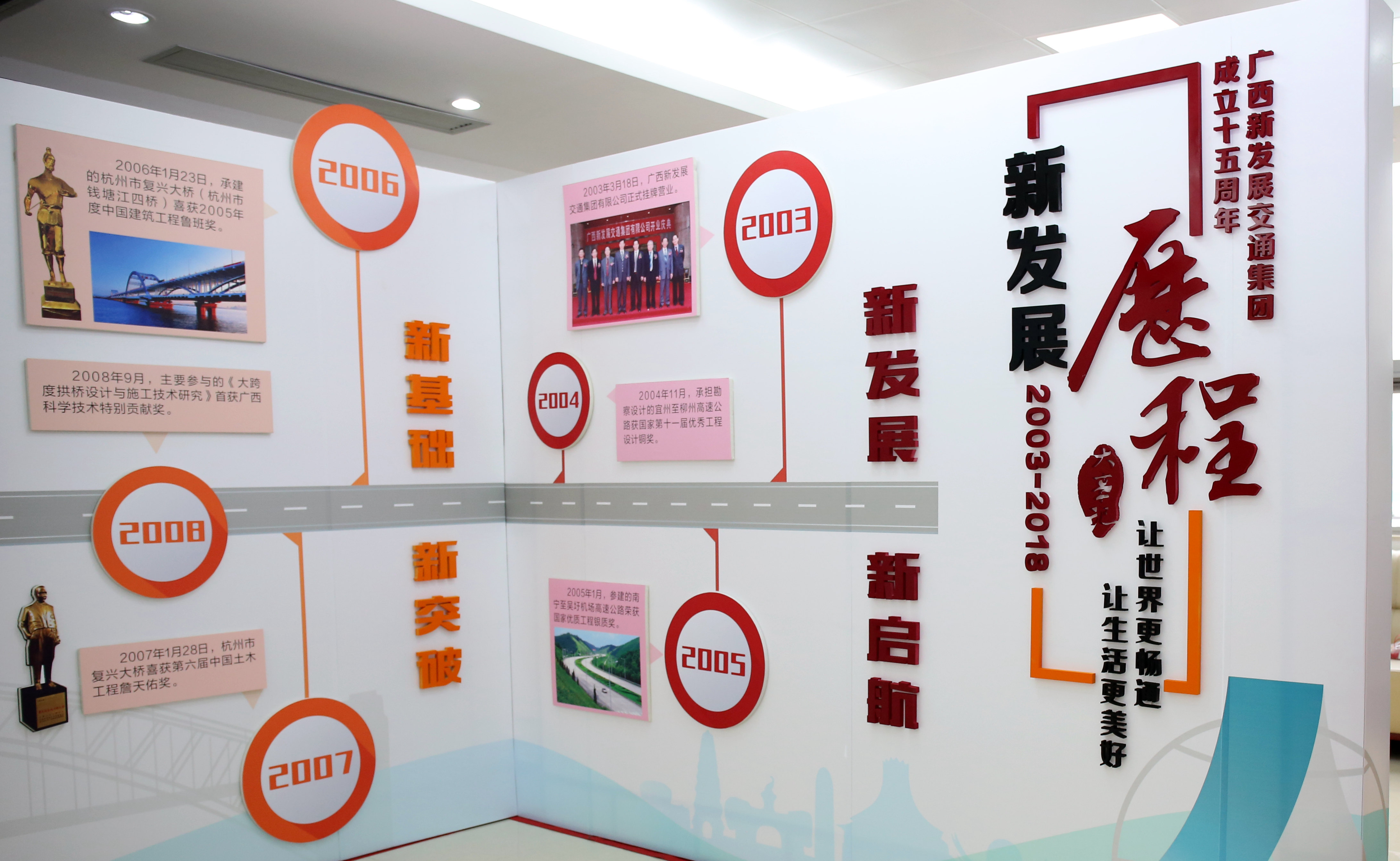 在活動現(xiàn)場入口處,設(shè)置有一面企業(yè)發(fā)展歷程墻,展示了歷年來集團公司發(fā)展取得的矚目成績?;顒娱_始后首先播放了《新時代 新發(fā)展 新征程》——廣西新發(fā)展交通集團15周年紀錄片,對15年發(fā)展史進行了有聲有色的回顧。